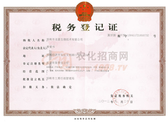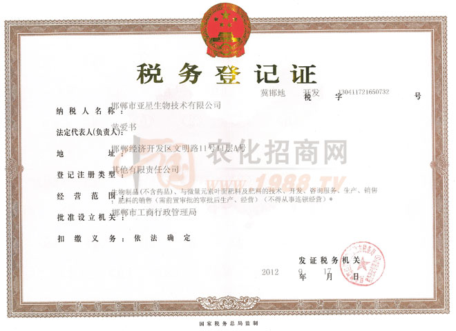 證書名稱:稅務(wù)登記證 發(fā)證機(jī)構(gòu):邯鄲市工商行政管理局