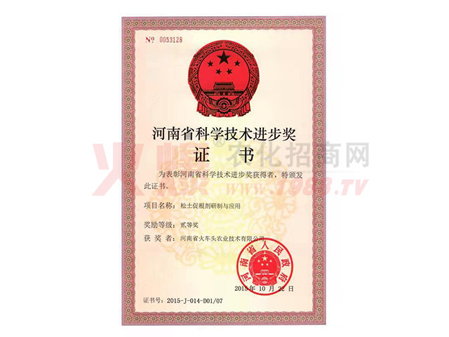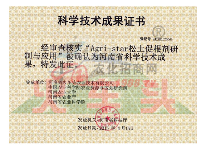 2015年松土促根劑項(xiàng)目經(jīng)河南省科技廳組織專家組進(jìn)行鑒定,達(dá)到國(guó)際先進(jìn)水平,國(guó)內(nèi)外沒有同類報(bào)道,被科技日?qǐng)?bào)譽(yù)為“修復(fù)土壤的保護(hù)神”;