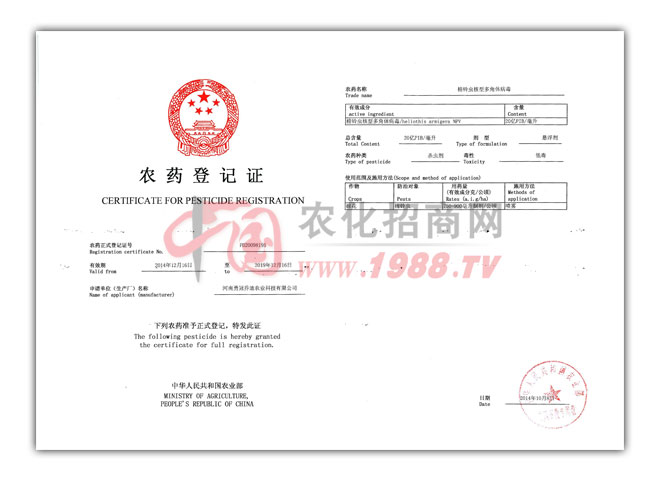 公司主導產品“蛤蟆王”“勇冠”牌NPV棉鈴蟲病毒殺蟲劑,被認定為河南省批高科技產品和新產品,被列入國家“八五”火炬計劃項目,2001年,其年產5000噸棉鈴蟲病毒殺蟲劑工程,被推薦列入國家高技術產業(yè)化推進項目。